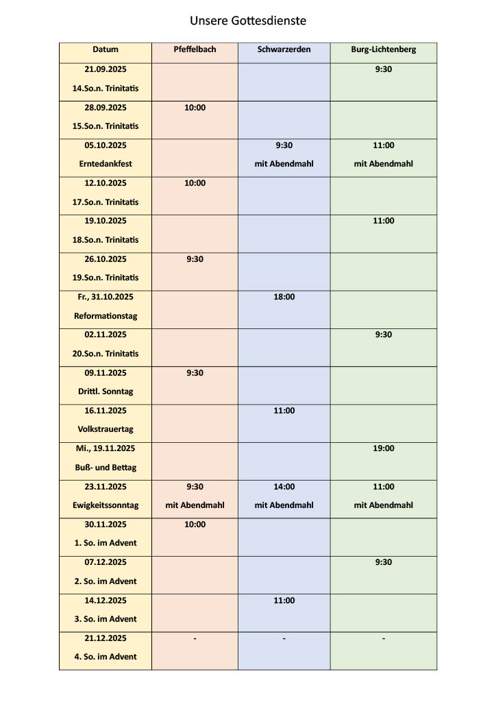 Seit die Kirchengemeinden Pfeffelbach (Kirchen Pfeffelbach und Schwarzerden) und Burg-Lichtenberg pfarramtlich miteinander verbunden sind (ein Pfarrer ist für beide Kirchengemeinden zuständig), finden die Gottesdienste i.d.R. jeden Sonntag im wöchentlichen Wechsel statt.
